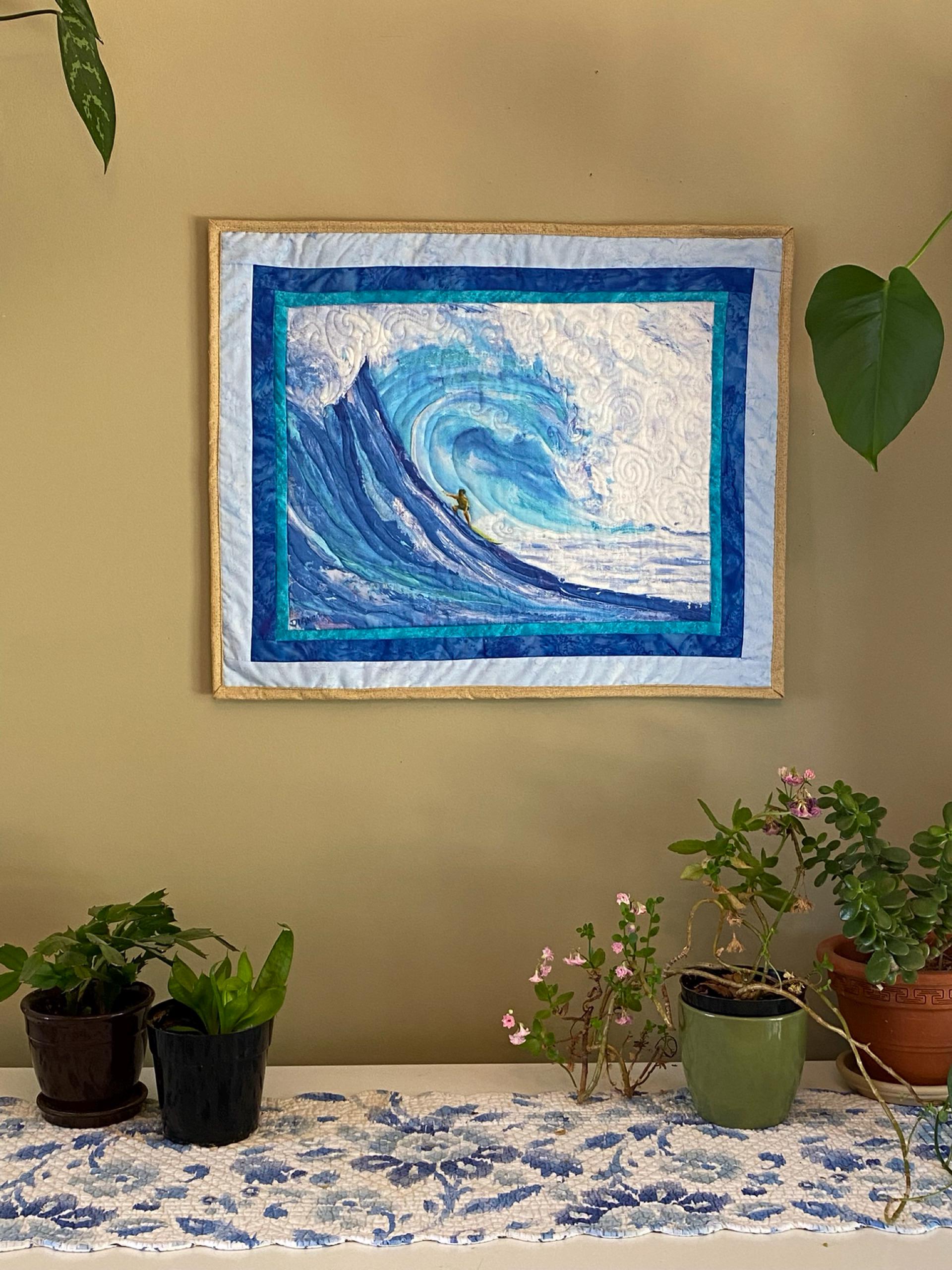 This Wave fabric quilt square or panel has stunning turquoise colors in the water, the surfer almost being vertical on the wave, and the beautiful white caps breaking overhead! Award winning artist Diane Appler of Maui, Hawaii, hand painted this design of Kai Lenny surfing at the Big Wave competition at Peahi on Maui north shore and I have printed it on cotton fabric and made into quilt squares and panels. This would be a beautiful addition to a special quilt, wall hanging, pillow, place mat, etc. You can choose the size you would like from the drop down menu above.
